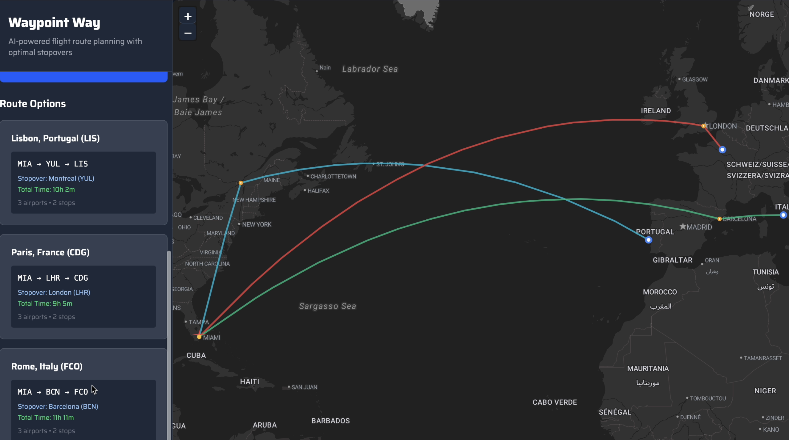 AI-powered flight route planning application with strategic stopovers and interactive world mapping.